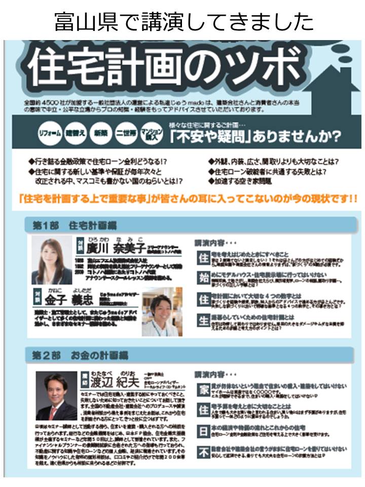 講演では、資金計画の立て方や賢いローンの借り方返し方の他に、住まいの購入で失敗する方の考え方も紹介しました。