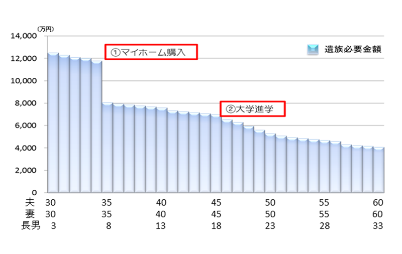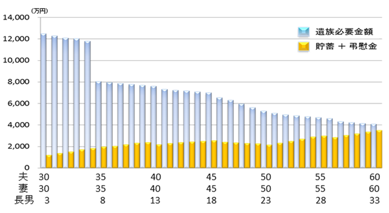 ご主人に万一のことがあった場合、奥さまと子供にいくら残してあげれば良いかを、グラフにしたものです。 遺遺族年金や障害年金を加味して算出しています。